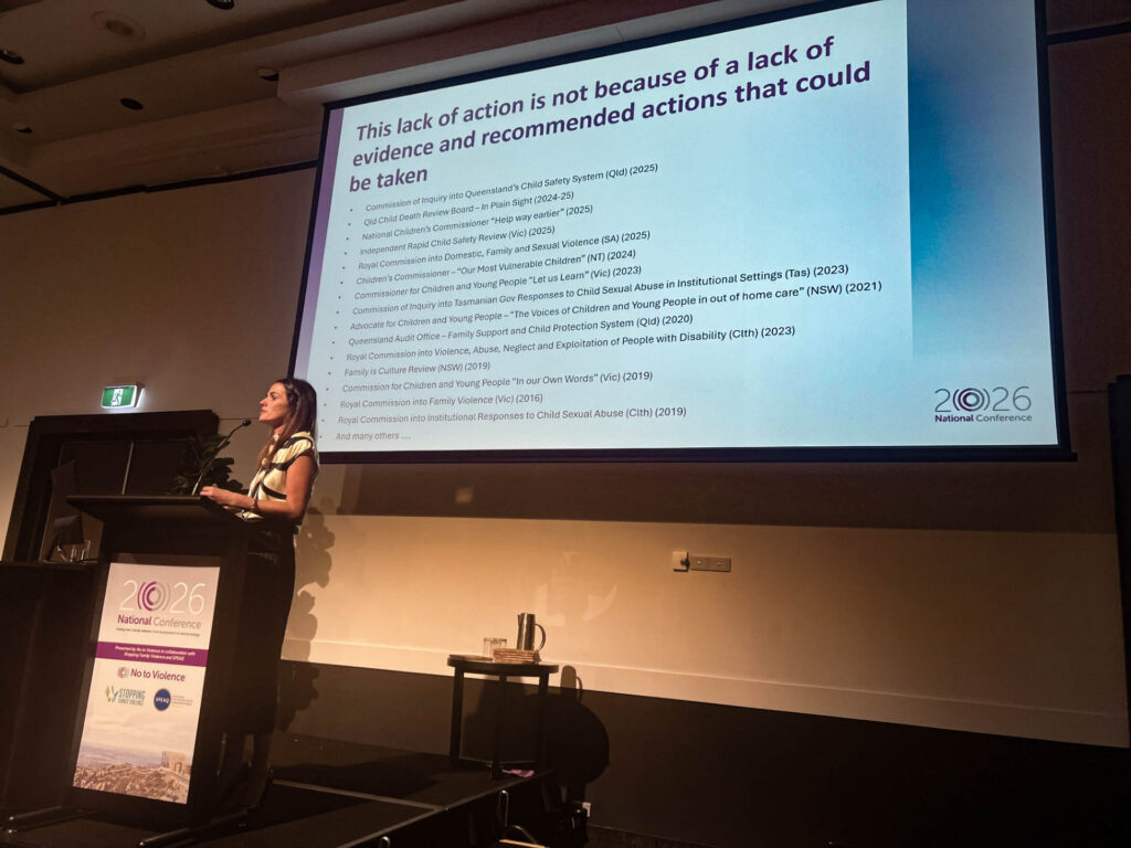 A strong theme throughout the conference was the need to centre the experiences of children and young people as victim-survivors in their own right. The Children and Young People stream on the afternoon of day two featured presentations from Dr Carmel Hobbs (University of Tasmania), who reflected on the distinct dynamics of youth intimate partner violence – including how developmental stage, peer relationships, and limited resources shape young people’s experiences – and Toby Stoddart and Peter Buckler from Home Base, who spoke about their programs with young people using violence, emphasising the importance of whole-of-family approaches and relational connection in driving change.