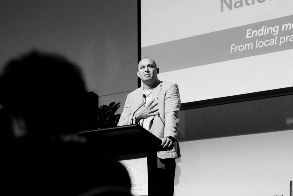 After taking a moment to pause and reflect, delegates refocused on the leading work of the Pathways Project. Enabled by the visionary support of the Snow Foundation, the project has engaged with over 150 practitioners across Australia to map out what an expanded and integrated ecosystem of responses to men’s violence needs to look like. As the political and policy interest grows and the range of interventions emerging across the continent, Pathways Project Lead Max Castle, sector leader Rodney Vlais, proud Wirangu, Kokatha, Mirning woman and Relationships Australia South Australia MBCP practitioner, Sareena Saunders and Biljana Milosevic, CEO of Jannawi Family Centre, shared initial insights from the project’s findings. While practitioners deeply value the need to grow the range of services available, they are concerned that this growth needs to be safe. A key output of the report is a guiding framework to ensure safeguards for meaningful violence cessation. This was followed by a powerful presentation from Uncle Charlie Rowe from the Aboriginal Family Legal Service Queensland, who has been involved in the Pathways Project, sharing practice and community leadership lessons from working with Aboriginal men in the Bambra Mari program in Toowoomba.